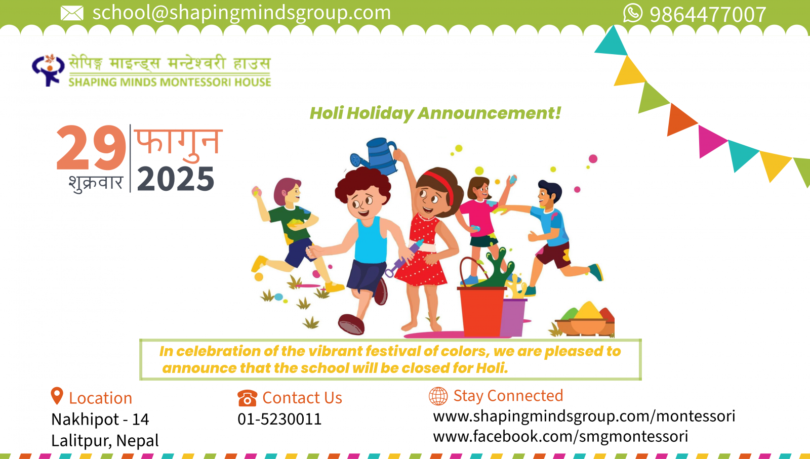 In celebration of the vibrant festival of colors, we are pleased to announce that the school will be closed for Holi.